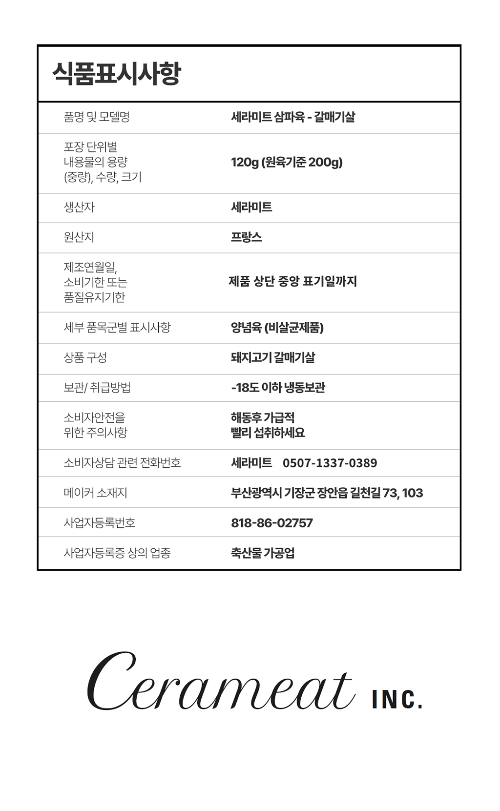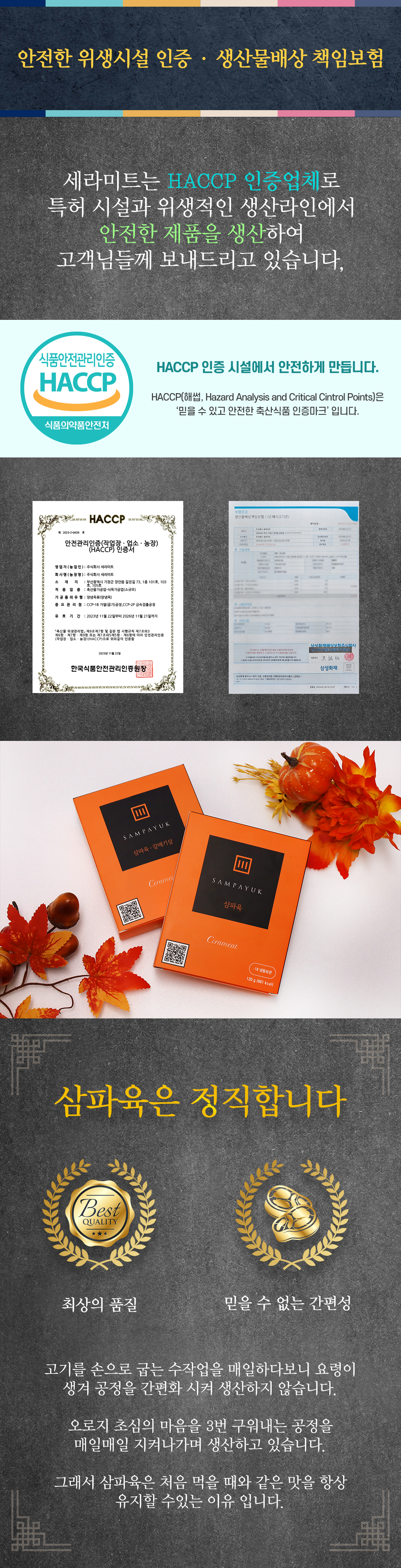 3분이면 간편하게 먹을 수 있도록, 특허 등록된 가마에서 원적외선으로 3번 구워낸 고품격 수제 삼겹살, 갈매기살. 삼파육입니다.